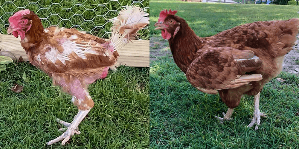 You can see for yourself the transformation a hen can go through from the harsh conditions of an egg farm to their loving forever home here in Delores.